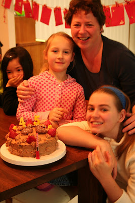 On the occasion of their mother's birthday, the Rice girls and we Ikegamis indluged in some trickery and skullduggery, to the end of making her a cake.